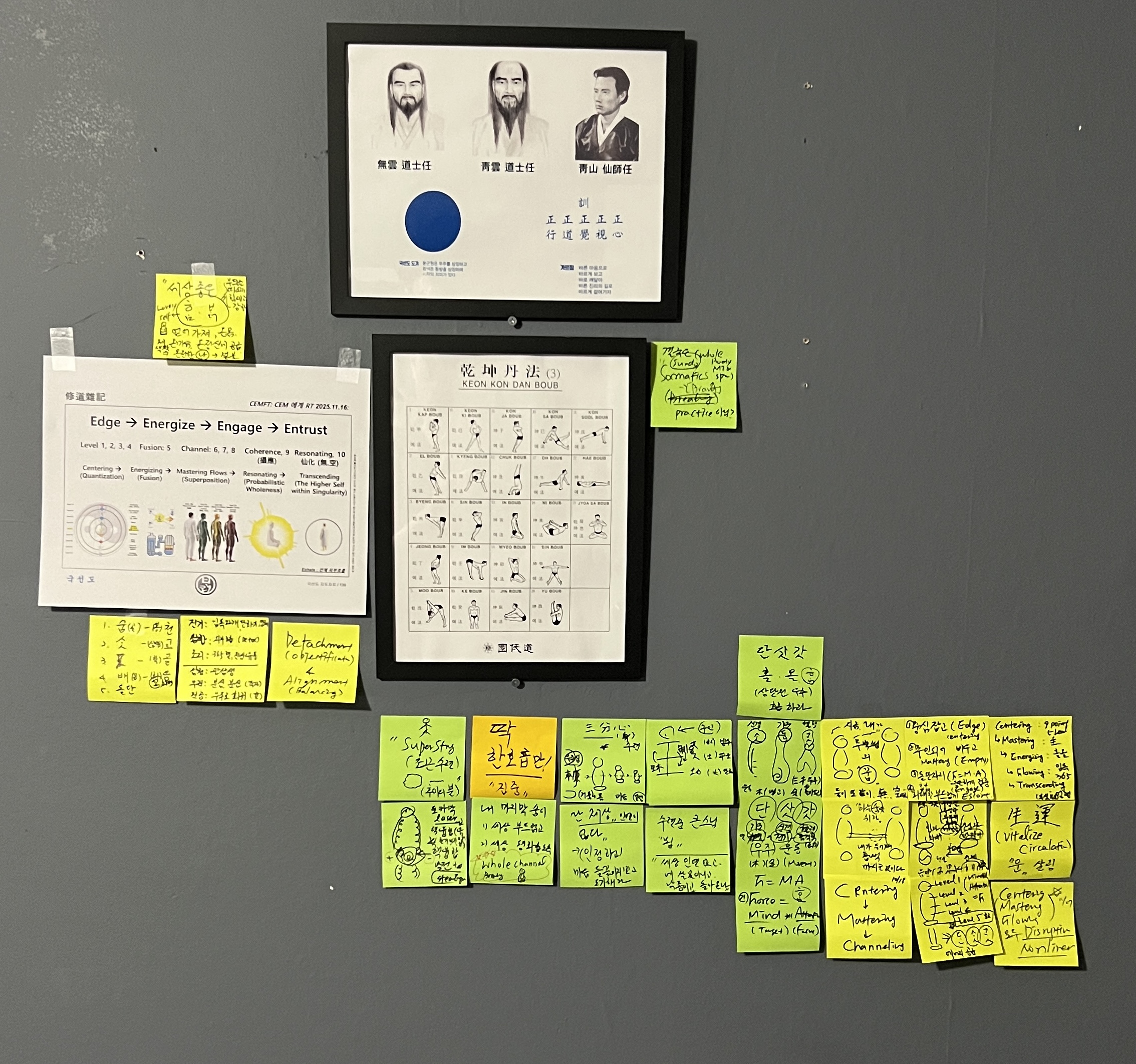 - Theory (bottom: color-coded post-its linking physics, physiology, and Sundo Ki theory)